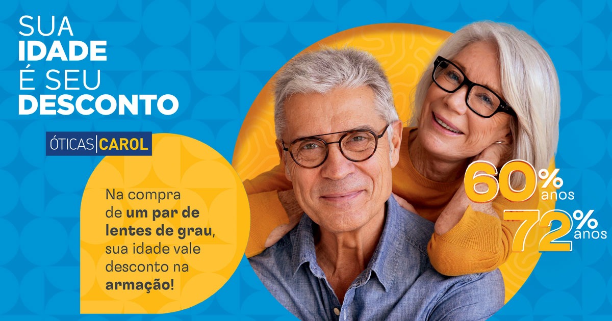 Aqui na Óticas Carol, na compra de um par de lentes de grau, sua idade vale desconto na compra da armação